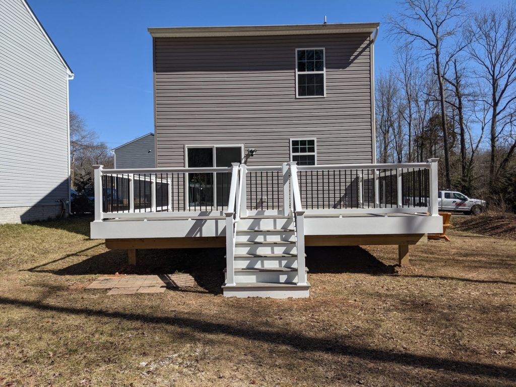 Without a back deck, one Glen Burnie family used the grassy area below a few wooden steps for grilling, entertaining, and cozying up by their outdoor fire pit. Jeff Gottleib, one of Fence & Deck Connection’s knowledgeable Project Consultants worked with our clients to transform the space off of their sliding glass door into a more finished, usable outdoor space that provides enough room for all of those activities!