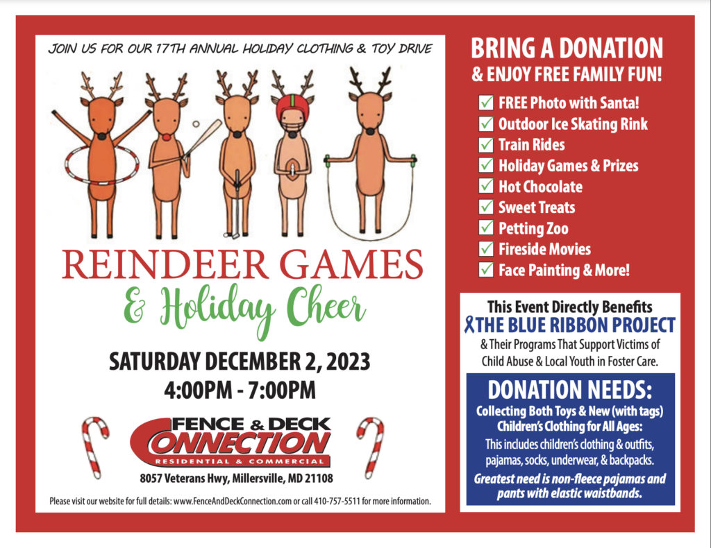 As we enter the season of giving, we are excited to announce this years 17th Annual Holiday Drive: Reindeer Games, December 2nd, 4-7pm at our Millersville location: (8057 Veterans Hwy, Millersville, MD 21108). This joyous holiday event directly benefits the Blue Ribbon Project, an Annapolis-based organization offering several programs directly serving children who are the victims of child abuse and neglect, as well as adult survivors of child abuse. As one of their “Backpacks of Love” drop-off locations, we help raise awareness and collect backpacks containing essential necessities for kids of all ages who are entering the system. Each backpack is designed to be gender and very age specific and include such things as personal hygiene products, school supplies, changes of clothing for the child’s age, personal clothing, and age appropriate books and toys.