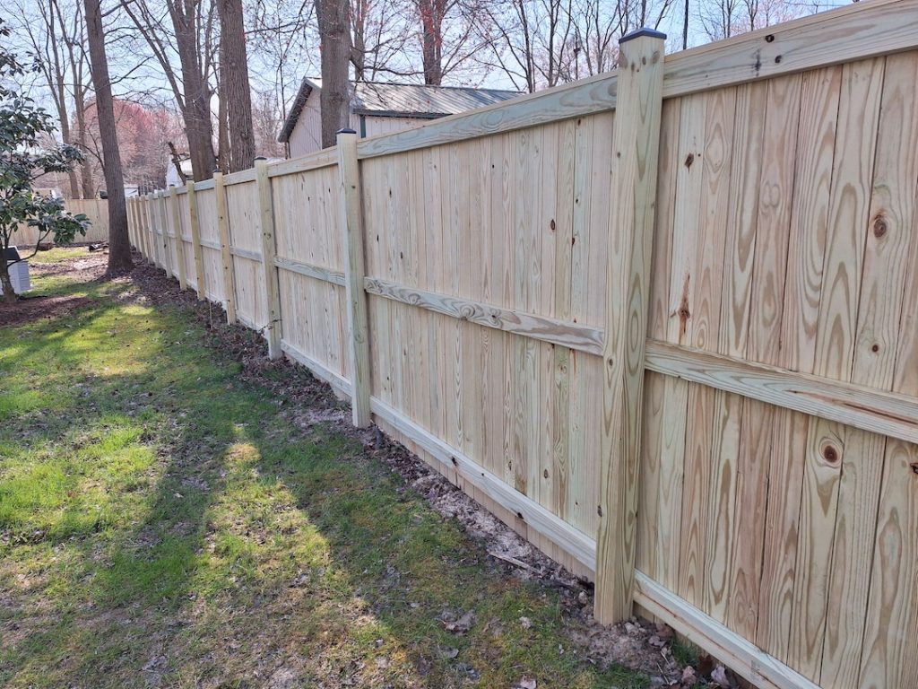 We first removed and hauled away the existing wood fencing, before replacing the side and back yard with 321 linear feet of new 6 ft. tall vertical board privacy fencing. We also installed one 5 ft. arched top all gate for easy access to and from the backyard. Vertical board fencing offers a classic and versatile option for homeowner seeking privacy, security, and aesthetic appeal. Pressure treated wood or cedar is the most traditional material used for vertical board fencing, offering a natural and warm appearance. With proper yearly maintenance, this new privacy wood fence in Stevensville, Maryland will last for years, giving homeowners a safe, secure, and beautiful outdoor space!
