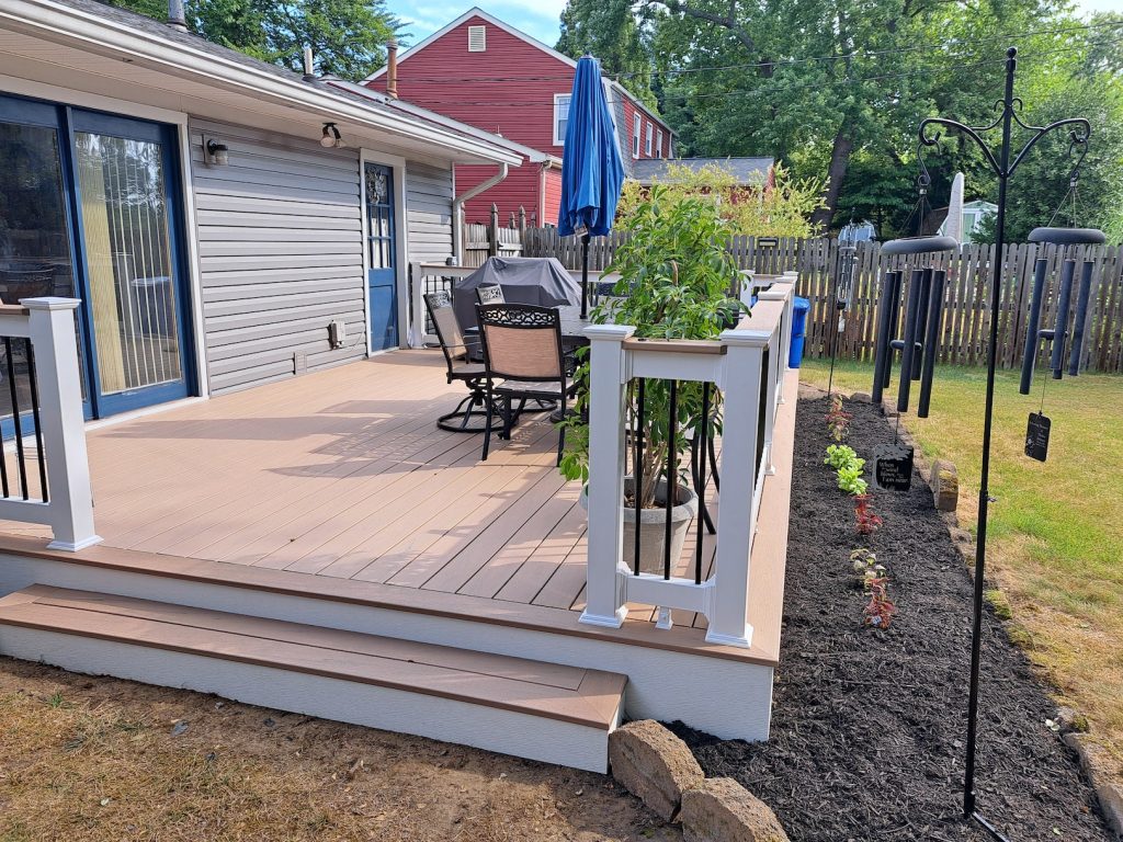 We first removed and hauled away the existing decking and framing before installing a 300 sq. ft. pressure treated wood frame. The new expertly crafted deck was adorned with Trex Lineage decking in the Carmel hue. The light and calming taupe tone of Carmel embraces the classic glow of white sands and Cyprus-covered cliffs, with its warm brown and grey hues that add an unyielding elegance to any outdoor space.