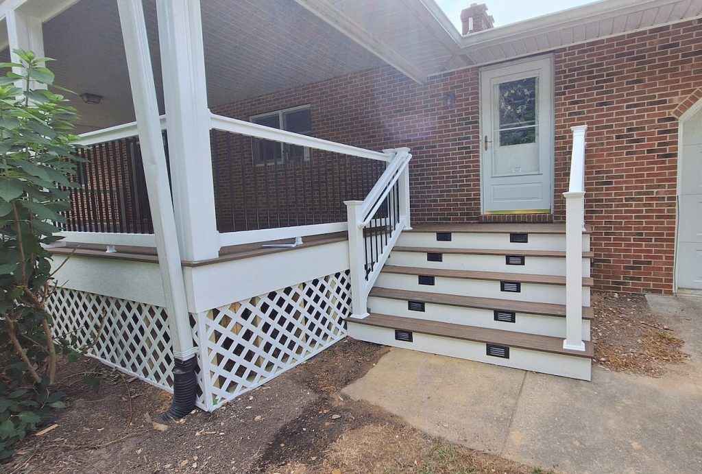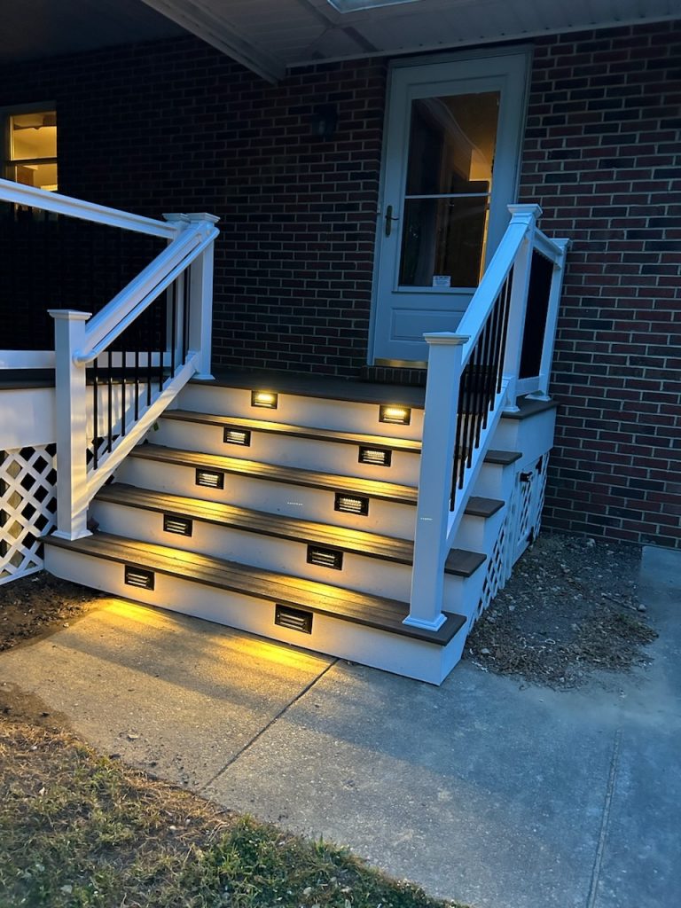 White vinyl railing with black round aluminum spindles enclose the front porch, and white vinyl fascia and wraps complete the new, clean and polished look. 2′ white diagonal lattice adorns the deck’s lower half, with one gate allowing for under-deck access. One set of five 7′ wide steps lead up to the porch and are illuminated by ten black Pyxis riser lights — a beautiful safety feature in the nighttime!