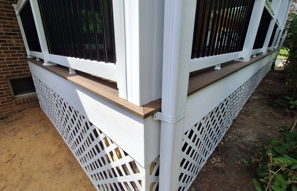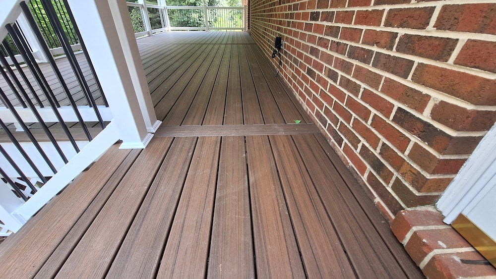 While deck removal is something our crews can accomplish before the installation of a new deck, some customers may opt to take on that initial task themselves. This was the case for this project — once the frame and deck boards were removed, our crews stepped in and also removed the support beams, posts, and roof support posts before raising temporary supports. We then installed 388 sq. ft. of Trex Enhance decking in the Toasted Sand hue with matching feature and seam boards. Trex decking is designed for maximum durability. It resists fading, staining, scratching and mold and won’t rot, crack or warp, regardless of harsh weather conditions or daily wear and tear. It’s insect-proof and splinter-free, making it safer and more comfortable for families with kids and pets.