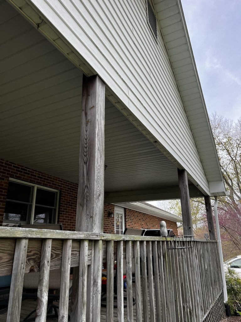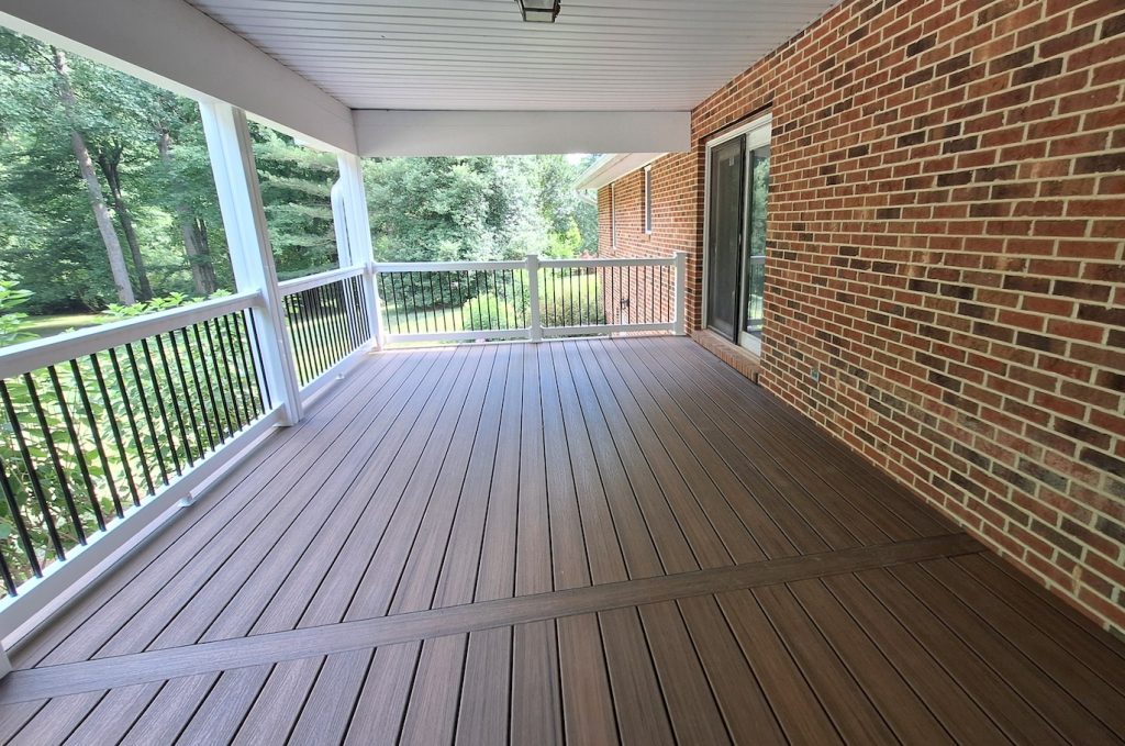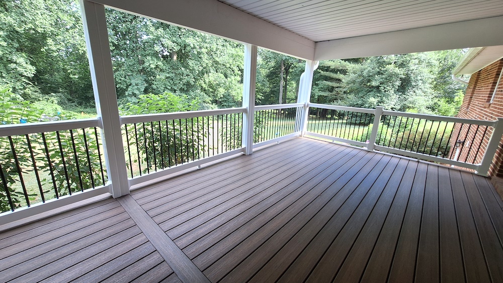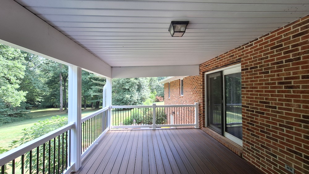Brian Hannon, one of Fence & Deck Connection’s knowledgeable Project Consultants, met with homeowners in Harwood, Maryland to discuss their vision for their new front porch, as their wood porch was showing signs of age. During that initial meeting, our Sales Consultants go over product recommendations and provide various color options of composite decking in various price points. Continue reading below to see the end result of this beautiful Trex composite front porch!