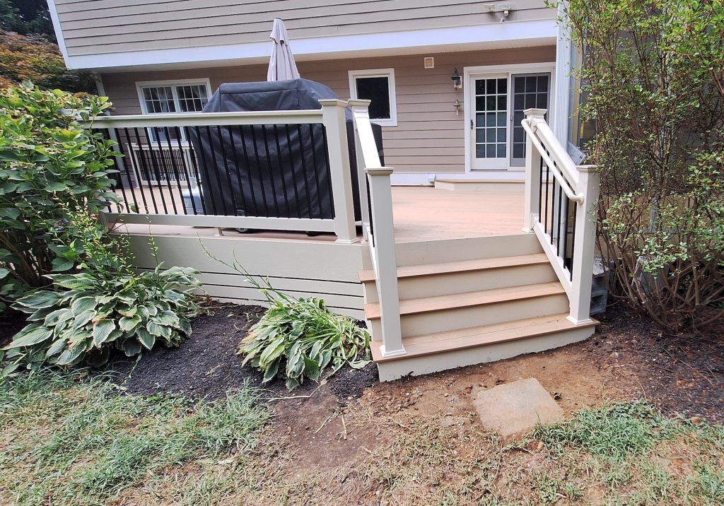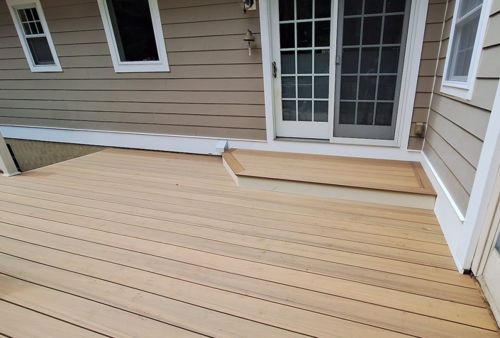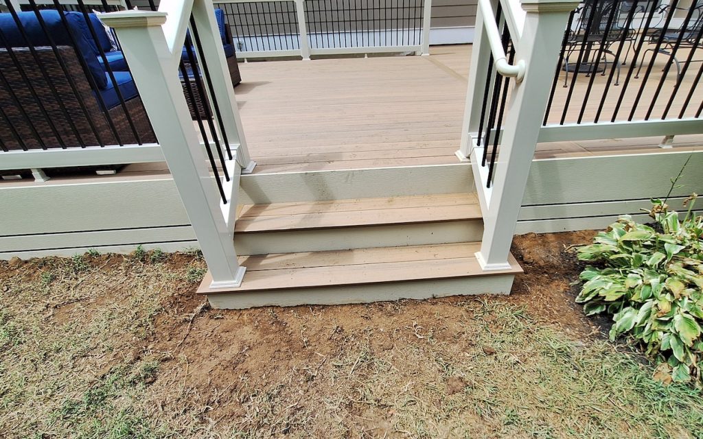 To complement the light golden tones, the new space was adorned with tan textured vinyl fascia and tan Washington-style vinyl railings. Like the original deck, we installed two new sets of picture-framed stairs to grade. Additionally, we installed a picture-framed box step at the backdoor entrance point.
