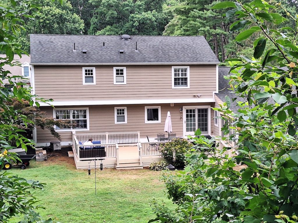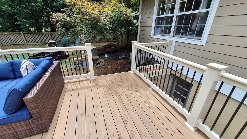 We first removed the existing deck and rotten rim board of the house and hauled away the materials. We then installed a new deck using TimberTech Edge Prime+ composite decking in the stunning Coconut Husk hue. Coconut Husk is a a bright, sunny tan color with dark and light golden tones to create an authentic light wood visual. This color is a beautiful alternative to natural wood decking and in general, the Prime+ collection features subtle color blending and a rift- and quarter-sawn straight grain pattern with lighter weight scalloped profile premium polymer capped composite boards.