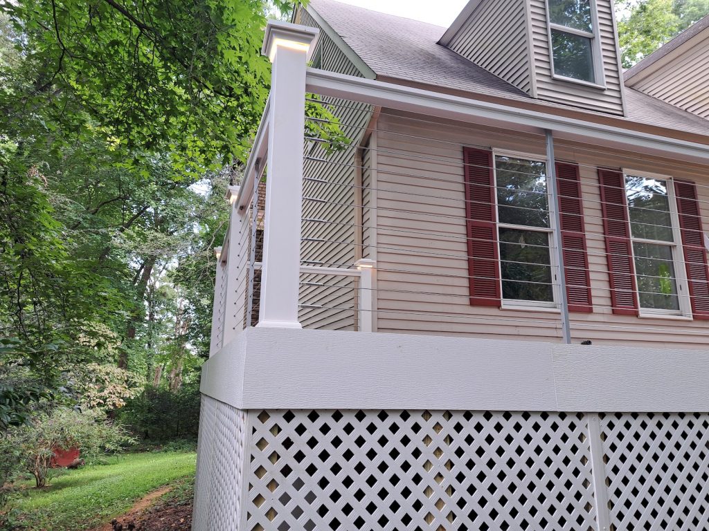This deck is unique in that it also was installed with another leader in composite decking and railings — TimberTech. Flat white TimberTech Premier railing with cable rail safely encloses the home’s outdoor space. Timbertech Lighted Island post caps in matte finish top all posts, for a beautiful entry point in the nighttime. Cable deck railing is perfect for homeowners who want to enjoy gorgeous views while maintaining safety and durability. In general, cable deck railing offers unobstructed views and clear night lines from your deck, allowing you to fully appreciate your surroundings without bulky materials. This is a perfect option for a home with a spacious front deck like the one featured here. Horizontal cables running parallel along the entire length of the railing system offers clean lines and a minimalist appearance that complements contemporary architecture well.