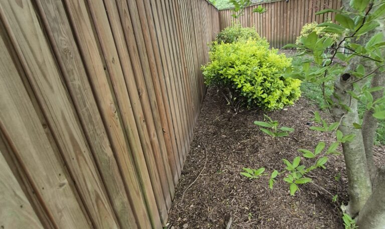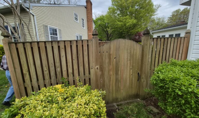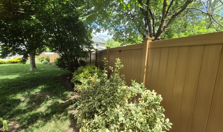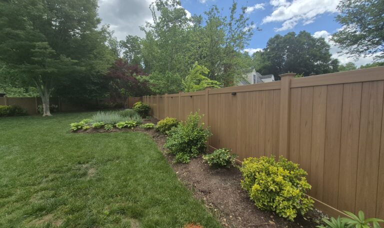 For the new fence, the homeowner selected approximately 260 feet of 6′ high vinyl fencing in a beautiful cypress color — a rich, earthy tone that complements the surrounding landscape while offering a modern, clean aesthetic. Vinyl fencing is not only visually appealing, but also a long-lasting, low-maintenance option ideal for Maryland’s seasonal weather fluctuations.