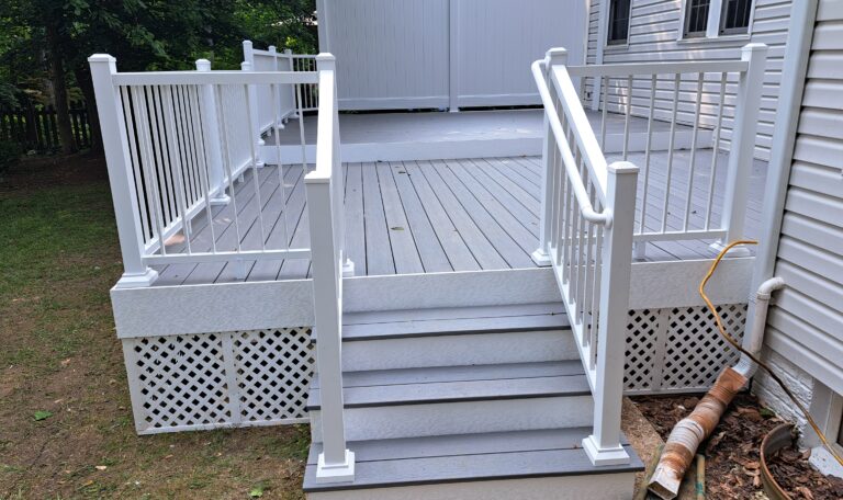 We began by removing the existing railing, decking, and stairs to make way for new, low-maintenance materials. For the decking, the homeowners selected TimberTech composite decking in “Sea Salt Gray,” a soft and modern hue that perfectly balances cool tones with warm backyard charm. Not only does this composite material offer excellent durability and slip resistance, but it also resists fading, staining, and mold, making it ideal for Maryland’s varied climate. The deck boards alternated direction on the upper and lower decks, which creates a great artistic element and distinction for both spaces.