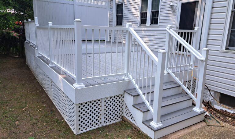 We rebuilt the stairs to grade, ensuring the top stair sits flush with the deck surface, matching the original layout and providing a seamless entry and exit point. To keep the space underneath the deck neat and enclosed, our crew installed white vinyl lattice skirting along the base, complete with an access gate for convenience and storage.
