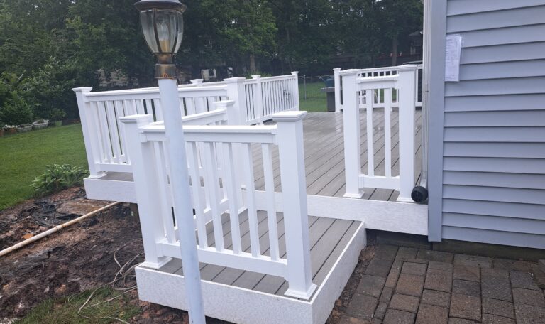 Before all these beautiful changes could take place, we demoed and hauled away the existing deck, making room for the new vision to come to life. In addition to the new Trex Tide Pool decking, we also upgraded the railings and fascia. The sleek white PVC railings, paired with standard balusters, lend an elegant yet minimalistic touch to the design. These railings are durable, weather-resistant, and low-maintenance—perfect for homeowners who want beauty without the hassle. The white PVC fascia wraps were also installed to complete the refined look, providing a clean and polished finish along the edges of the deck.