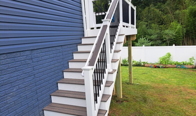 To tie the space together, we wrapped the perimeter of the deck with white PVC fascia, offering a crisp, clean edge and added durability. The underside of the deck remains open-framed, giving the homeowners flexibility for future storage or landscaping options. We also constructed a set of steps leading to grade, with a gate installed at the top for added safety. In addition, two steps were added at the home’s side door entrance without railings, ensuring convenient access while maintaining the home’s overall aesthetics.