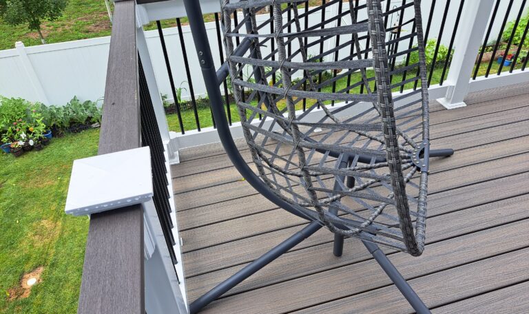 The foundation of this transformation began with the installation of approximately 270 square feet of Trex Enhance Naturals decking in Rocky Harbor, a soft, versatile gray with natural woodgrain texture that offers the look of real wood without the upkeep. This composite decking is ideal for Maryland’s ever-changing seasons, offering exceptional fade and stain resistance. The decking is complemented by white PVC railings featuring round black aluminum balusters, which provide a striking contrast and open feel. For a premium finish, we installed a 2×4 Azek Vintage cap rail in Dark Hickory, terminating neatly into the posts for a polished, upscale look.