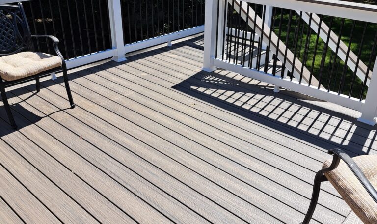 The deck’s perimeter was finished with crisp white fascia boards, completed with matching white plugs for a clean, cohesive look. A classic white vinyl railing with sleek black round aluminum spindles was chosen to provide a timeless aesthetic while offering safety and durability.
