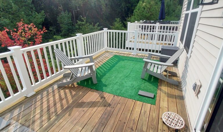 We kept the original framework and removed the existing wood deck boards and vinyl railing. We then installed 110 sq. ft. of TimberTech Driftwood decking, selected for its rich color tones, low maintenance needs, and long-lasting performance. To elevate the look further, a Driftwood feature board was added around the 38′ outer perimeter, creating a framed finish that gives the entire deck a polished look.