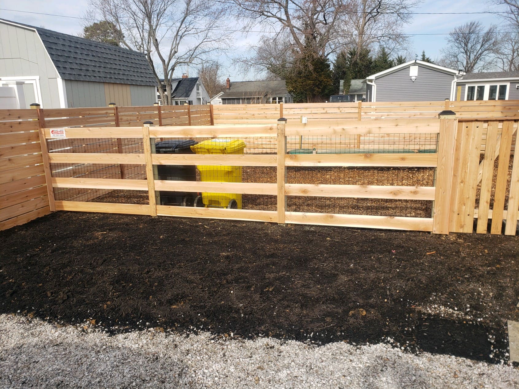 Gallery Fences Decks Screened Porches 6 foot Cedar Horizontal Alternate Picking Style Fencing with 1x6 1x4 1x4 pattern6 foot Cedar Horizontal Privacy Fencing with 1x4 pickets6 foot high cedar horizontal fencing with spaced 1x4 horizontal cedar boards6 foot high Horizontal Cedar board fence with matching walk gate6 foot high Horizontal Cedar board fence6 foot Horizontal cedar fencing with no spacing between the pickets and single flat top walk gate6 foot Horizontal cedar stepped fencing with no spacing between the pickets with standard black post caps (2)6 foot Horizontal cedar stepped fencing with no spacing between the pickets with standard black post caps (3)6 foot Horizontal cedar stepped fencing with no spacing between the pickets with standard black post caps42 inch high cedar horizontal semi-privacy fence with alternating 1 x 4 and 1 x 6 spaced cedar boards and Dog Ear postsPressure Treated Spaced Horizontal Fence with 1x6 Boards and matching walk gate3_h Cedar Horizontal Fence wDog Eared Post Mixed 1x6 1x4 & 1x2 Pickets Runners w Spacing 23_h Cedar Horizontal Fence wDog Eared Post Mixed 1x6 1x4 & 1x2 Pickets Runners w Spacing with matching 3 foot walk gate with Standard Hardware3_h Cedar Horizontal Fence wDog Eared Post Mixed 1x6 1x4 & 1x2 Pickets Runners w Spacing with matching 3 foot walk gate3_h Cedar Horizontal Fence wDog Eared Post Mixed 1x6 1x4 & 1x2 Pickets Runners w Spacing with matching 5 foot walk gate with standard hardware3_h Cedar Horizontal Fence wDog Eared Post Mixed 1x6 1x4 & 1x2 Pickets Runners w Spacing with matching 5 foot walk gate3_h Cedar Horizontal Fence wDog Eared Post Mixed 1x6 1x4 & 1x2 Pickets Runners w Spacing4 foot tall 4 board estate style fence with 1x6 cedar and 2x4 black vinyl coated wire and 5 foot horizontal cedar fence5 foot high Cedar Horizontal Board Fence wtih 4 inch Cedar spaced approximately half inch apart5_ high Cedar Horizontal Board Fence Boards 4 inch Cedar spaced apart 25_ high Cedar Horizontal Board Fence Boards 4 inch Cedar spaced apart with matching gate5_ high Cedar Horizontal Board Fence Boards 4 inch Cedar spaced apartrvressd FENCE ESTIMATOR Use Our Online Fence Estimator To Get A FREE Budgetary Fence Estimate Today. Try Estimator Tool TRY ESTIMATOR TOOL FREE ESTIMATE Select State Maryland Delaware Georgia Virginia Select Product How did you hear about us? Google Word of Mouth Referral Fence Sign Door Hanger Direct Mailer Vehicle Sign Social Media Other residential See Full Bio Fences – Vinyl – Post & Rail Fences – Vinyl Fences – Picket