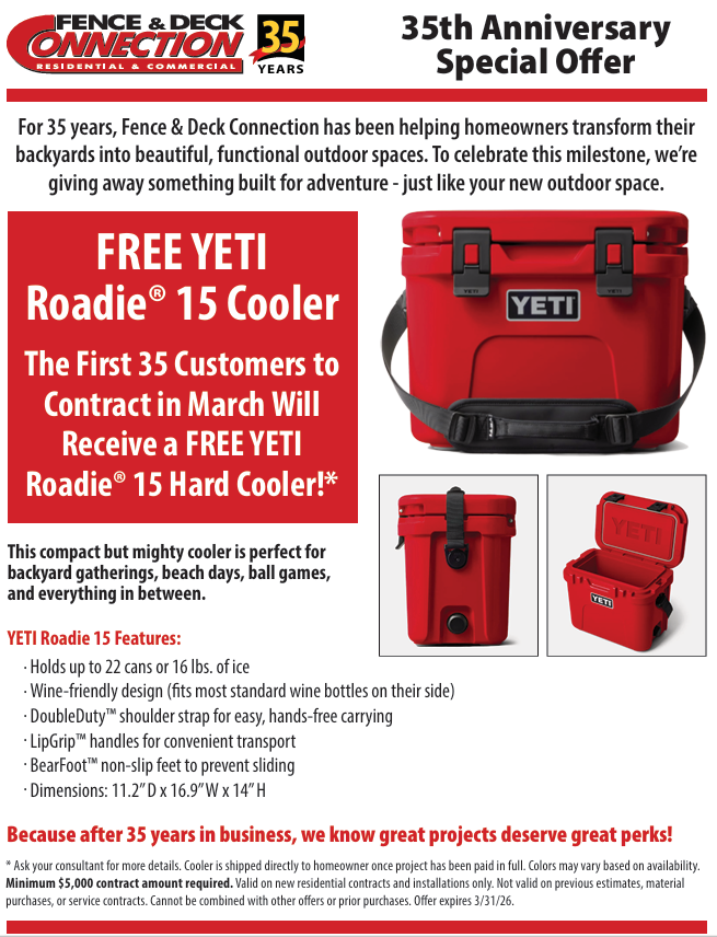 Every month, Fence & Deck Connection offers new specials and discounts for our valued customers. These discounts on new fence, deck, and screened porch installations change every month, so don’t wait too long or you might miss out on a great deal!